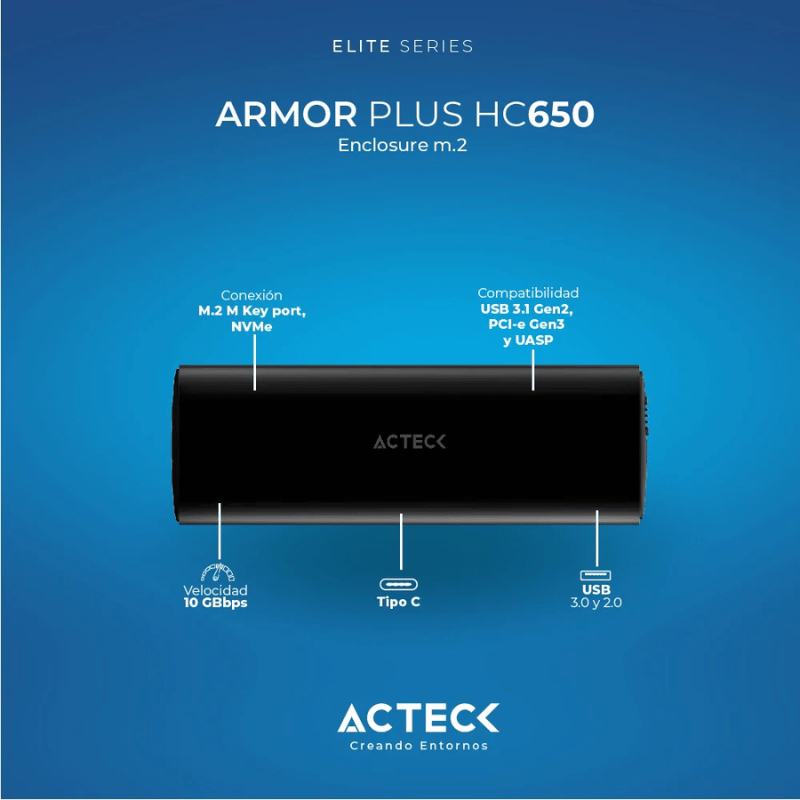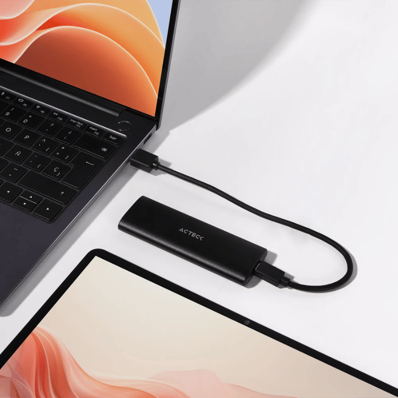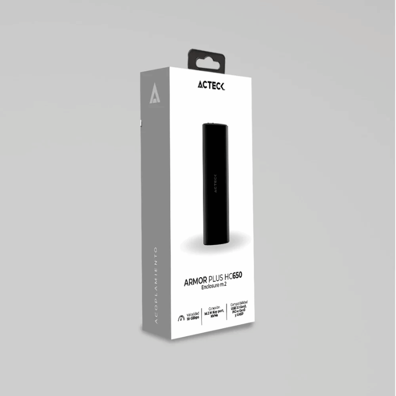 La carcasa cuenta con una versión USB 3.2 Gen 2 (3.1 Gen 2), lo que garantiza una transferencia de datos rápida y eficiente. Además, tiene un conector USB tipo A y USB Tipo C, lo que la hace compatible con diferentes tipos de dispositivos.