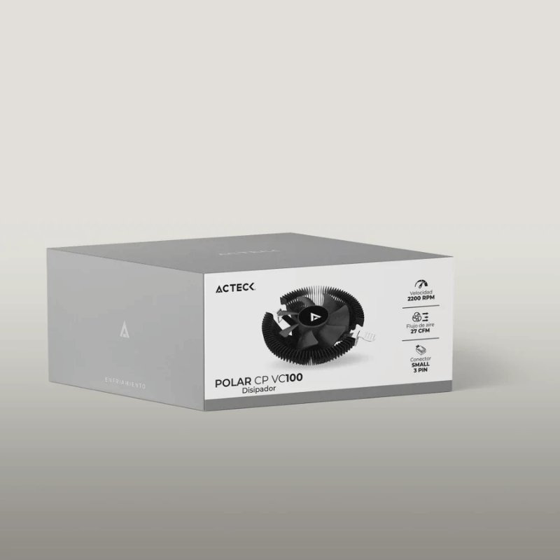 El producto se presenta en una caja y tiene dimensiones de 103 mm de ancho y 103 mm de altura. Este disipador no incluye iluminación LED, lo que lo hace ideal para configuraciones que buscan un aspecto más sobrio. Con un solo ventilador, el Acteck AC-936736 se posiciona como una solución eficiente y efectiva para el enfriamiento de procesadores en diversas configuraciones de PC.