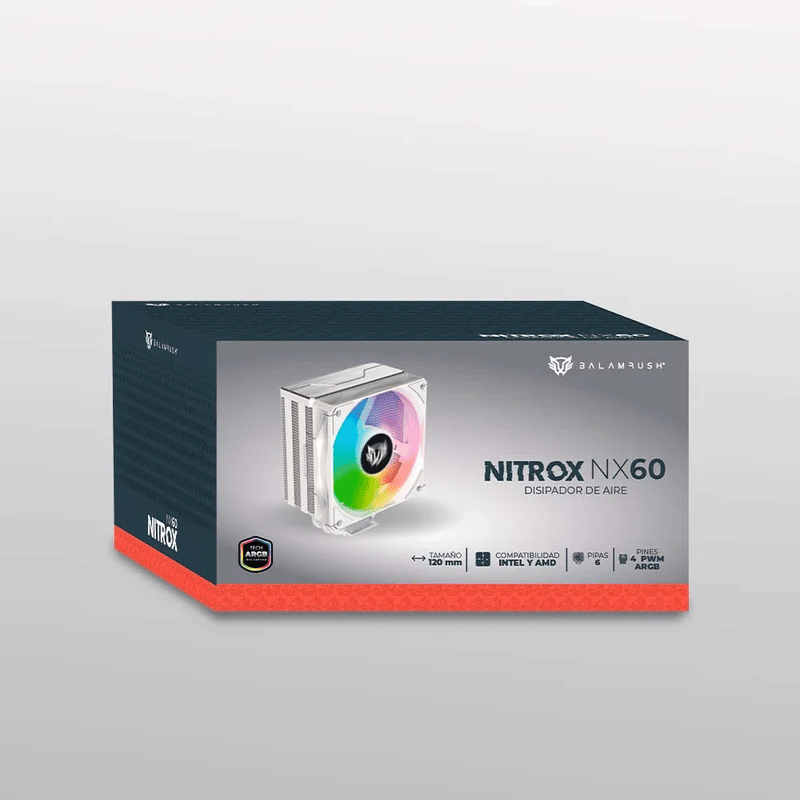 El Disipador CPU Balam Rush NITROX NX60W también incluye iluminación LED en colores azul, verde y rojo, lo que añade un toque estético al sistema. Está fabricado con materiales de aluminio y plástico, garantizando durabilidad y eficiencia en la disipación del calor. Con una potencia de diseño térmico (TDP) de 190 W, este enfriador es capaz de manejar cargas térmicas significativas, asegurando un rendimiento estable del procesador.