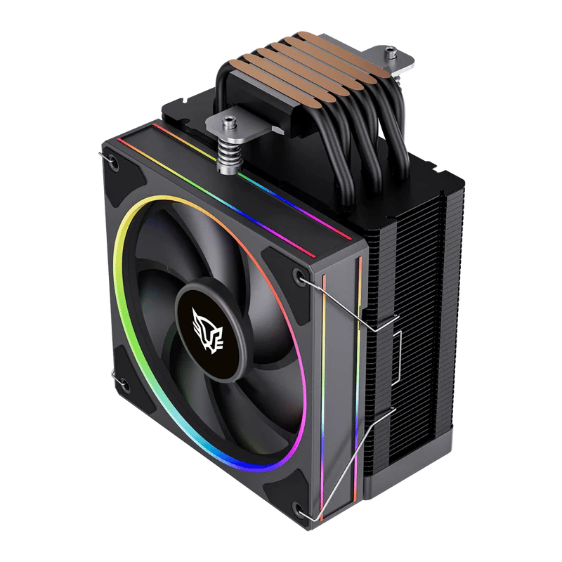 El ventilador tiene dimensiones de 120 x 27 x 120 mm y está fabricado con materiales de alta calidad, incluyendo aluminio, cobre y polibutileno tereftalato (PBT). La iluminación LED, que incluye 20 luces en colores ámbar, verde, rojo y azul, añade un toque estético al sistema. La potencia de diseño térmico (TDP) es de 240 W, lo que permite un rendimiento adecuado para procesadores de alto rendimiento.