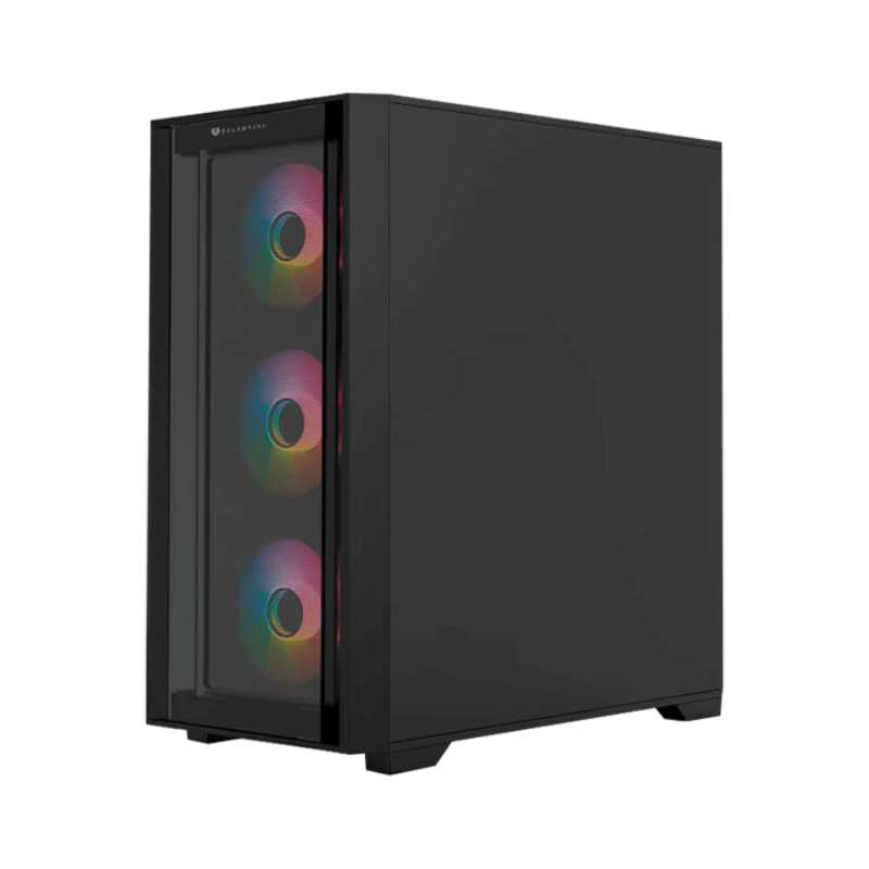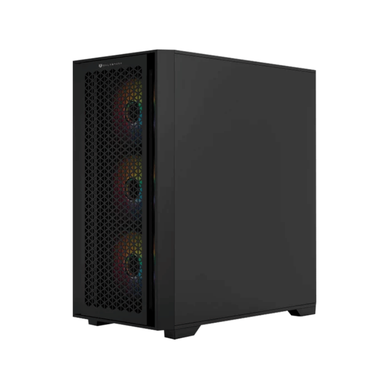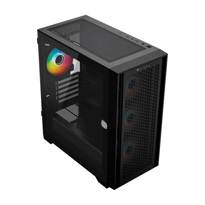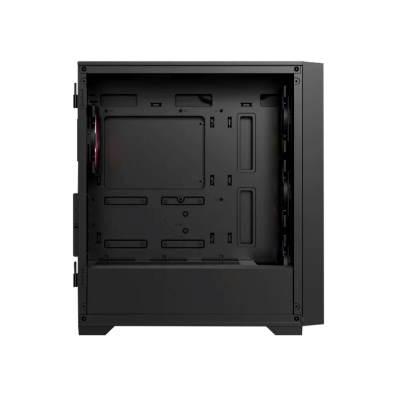 El diseño del gabinete incluye una ventana lateral que permite visualizar el interior, realzando la estética del sistema. Además, cuenta con iluminación en los ventiladores de la caja, disponible en colores ámbar, azul, verde y rojo, lo que añade un toque personalizable al equipo.