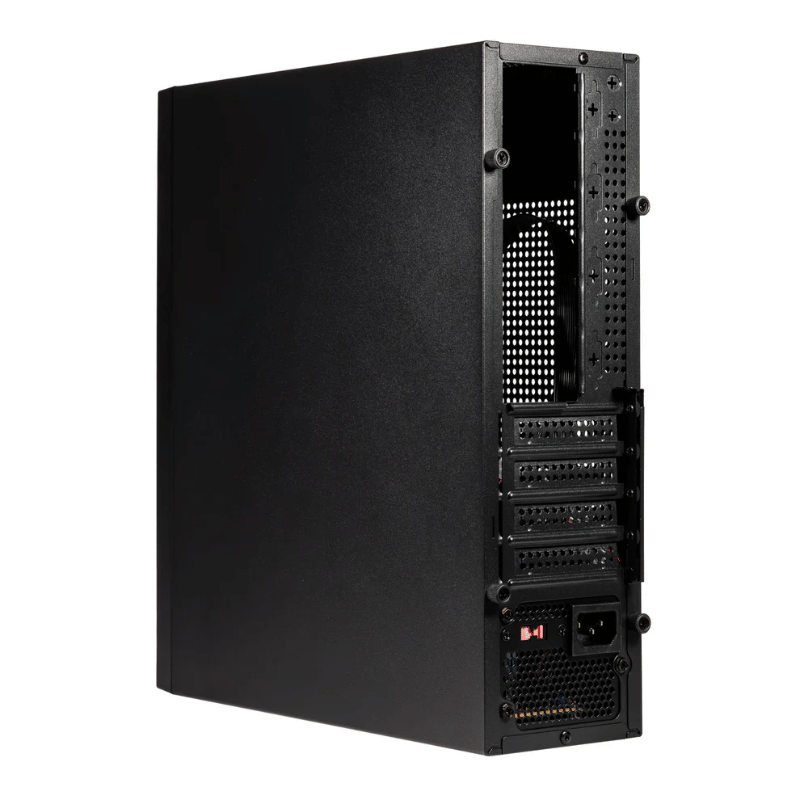 La fuente de alimentación incluida tiene una potencia de 500 W, garantizando un suministro adecuado de energía para los componentes instalados. La caja cuenta con un total de tres ventiladores instalados, de los cuales uno es trasero con un diámetro de 120 mm y dos laterales, también de 120 mm, lo que asegura una buena circulación de aire y un enfriamiento efectivo del sistema.
