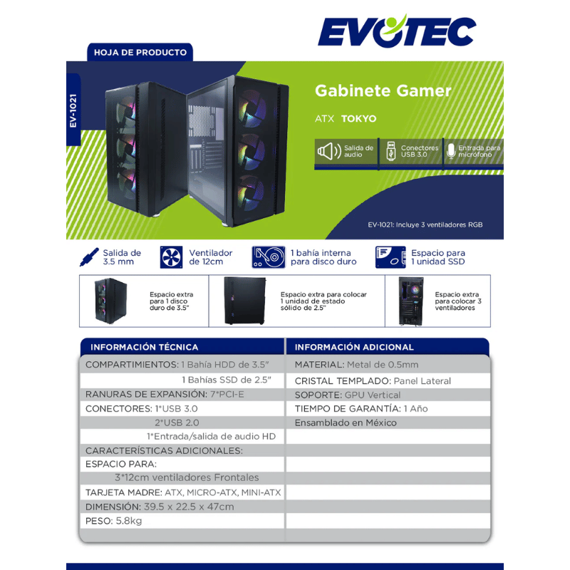 Este gabinete no incluye fuente de alimentación, pero es compatible con fuentes de tipo ATX. En resumen, el Gabinete Evotec EV-1021 es una opción versátil y funcional para quienes buscan un chasis que combine diseño y eficiencia en la refrigeración.