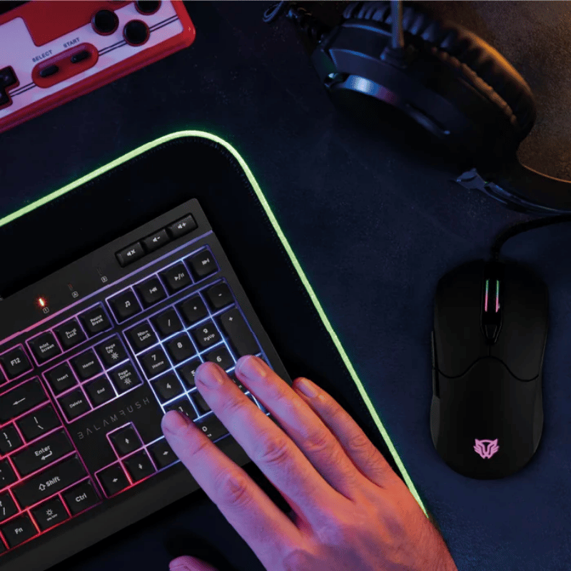 El mouse incluido en el kit tiene un diseño óptico con una resolución de movimiento de 7200 DPI y una velocidad de seguimiento de 30 ips, lo que garantiza precisión y rapidez en el manejo. Con un peso de 112 g y dimensiones de 125 x 64 x 42 mm, se adapta cómodamente a la mano. El mouse cuenta con 6 botones y una rueda de desplazamiento, facilitando la navegación y el control en juegos.
