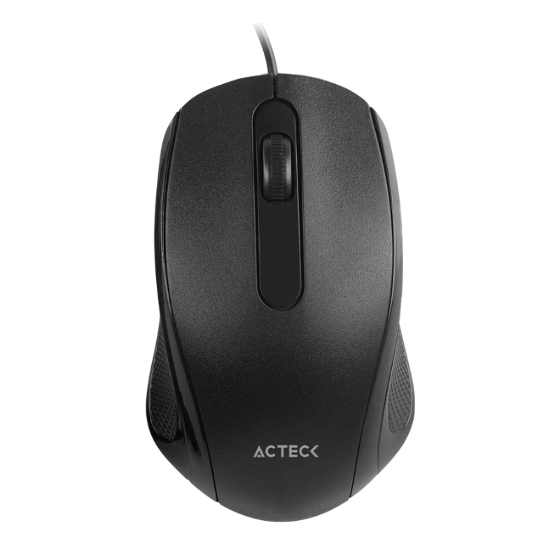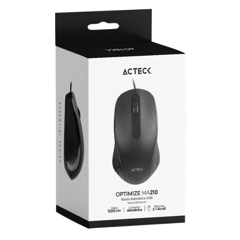 El paquete incluye únicamente el mouse Acteck Óptico Entry 100 en color negro mate, fabricado en plástico resistente y duradero. La superficie presenta una textura monótona que evita resbalones o sudoración excesiva durante su uso prolongado.