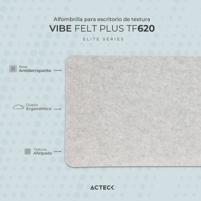 Este producto viene en color gris y se vende individualmente en paquetes de una pieza(s). En resumen, el Mousepad Acteck Vibe Felt plus TF620 es una elección confiable para quienes desean mejorar su experiencia informática mediante un accesorio funcional y resistente.