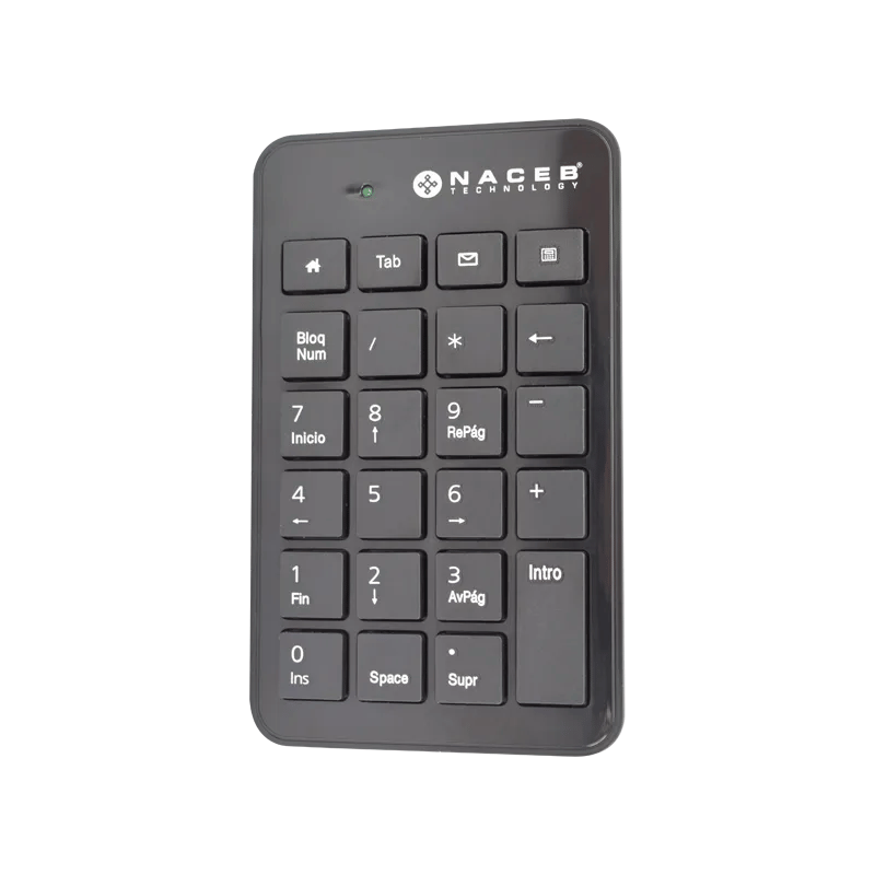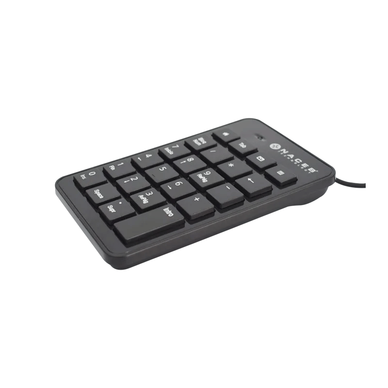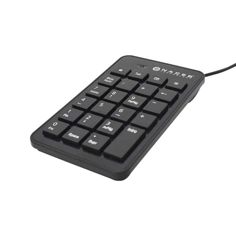 El teclado numérico Naceb NA-0104 es un dispositivo de entrada USB en color negro con una cantidad total de 23 teclas. Este producto funciona a través de un voltaje operativo de 5 V y cuenta con un cable que mide 1,35 metros de longitud para su conexión al ordenador o portátil.