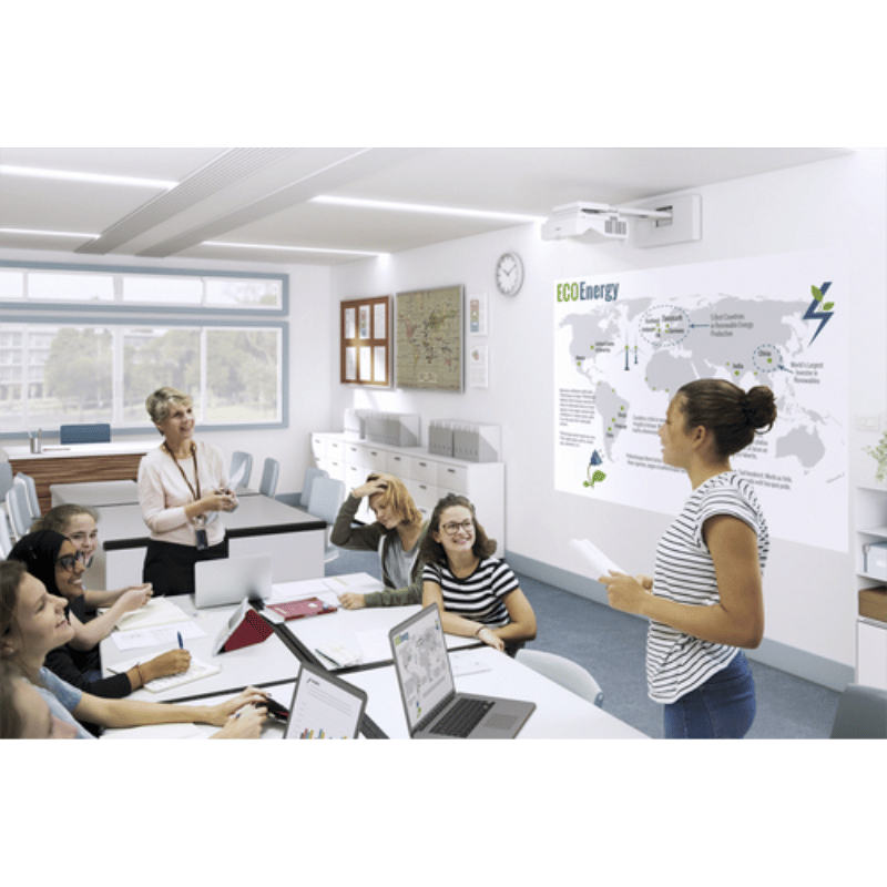 El dispositivo incluye altavoces incorporados y un nivel de ruido en modo económico de 27 dB, lo que lo hace adecuado para presentaciones en entornos silenciosos. Además, cuenta con conectividad Wi-Fi, permitiendo la proyección inalámbrica de contenido. La compatibilidad de tamaño de pantalla varía entre 1727.2 mm y 2540 mm (68 – 100″), y soporta relaciones de aspecto de 4:3, 16:10 y 16:9.