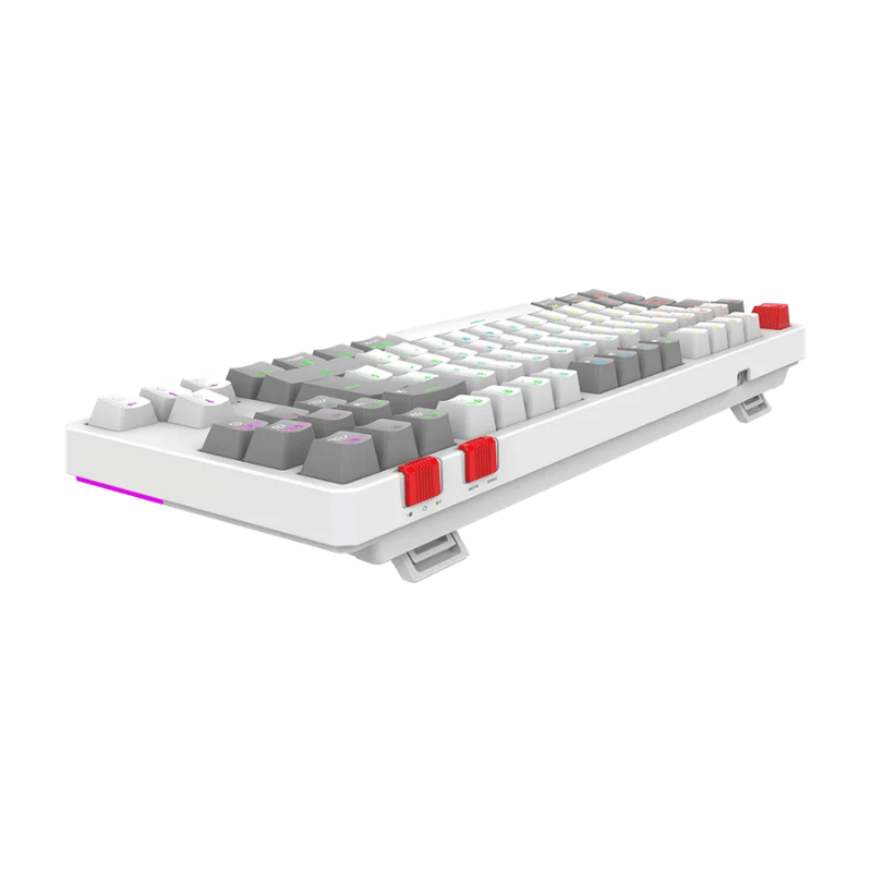 La retroiluminación LED RGB proporciona un efecto visual atractivo, con un color de luz de fondo multicolor. El teclado está diseñado en formato TKL (Tenkeyless), lo que significa que no incluye teclado numérico, optimizando el espacio en el escritorio. Las teclas son de doble disparo y están equipadas con interruptores mecánicos Outemu Red, que ofrecen una respuesta táctil adecuada para el juego.